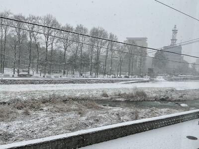 外は、美しい雪景色です。校舎の窓からは美しい岩手公園の