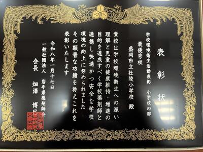 県学校薬剤師会より、本校の日頃の衛生管理の取り組みを評価していただき、「最優秀賞」をいただくことができました。